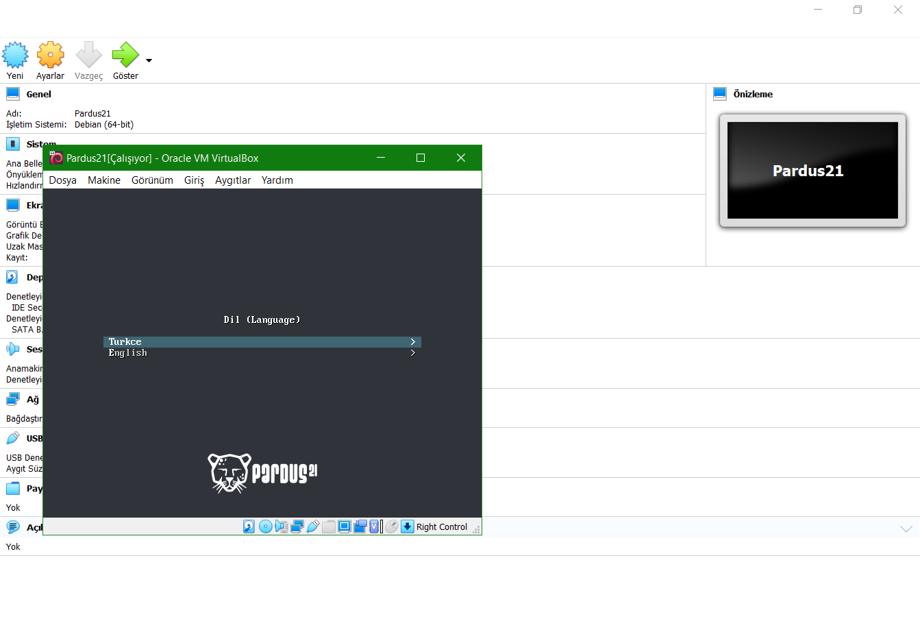 Resim 17. VirtualBox sanal makine Pardus kurulum dil seçimi